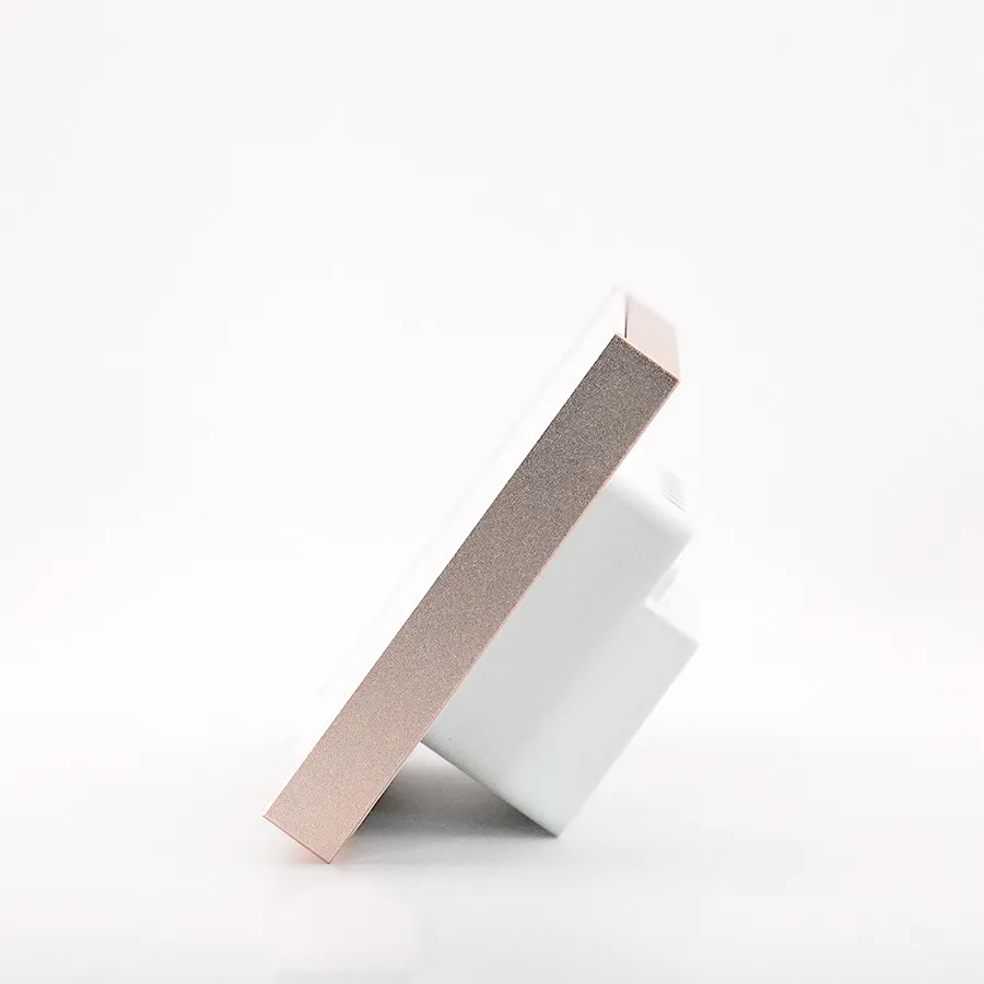 Thiết kế mặt kính cường lực, tráng gương bóng, viền nhôm nguyên khối chống oxy hóa, không dính vân tay, bảo vệ sản phẩm khỏi bị trầy xước, nứt vỡ khi va đập, ngăn chặn mồ hôi và các vết bẩn khác bám trên bề mặt kính, giữ cho mặt công tắc luôn sạch sẽ, sáng bóng, dễ dàng vệ sinh và giảm cong vênh khi lắp đặt. PET bảo vệ công tắc, chống bám bụi và sơn khi hoàn thiện công trình.